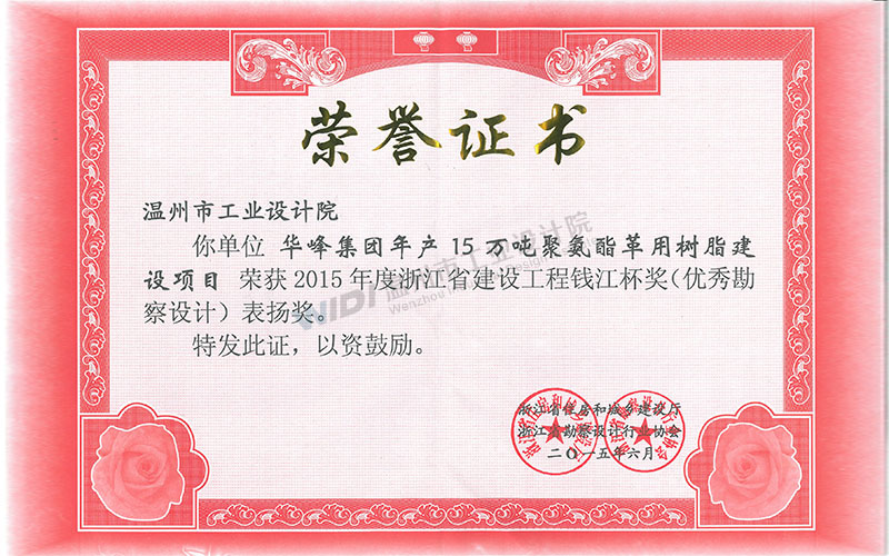 華峰集團年產(chǎn)15萬噸聚氨酯革用樹脂建設(shè)項目建設(shè)工程 錢江杯表揚獎